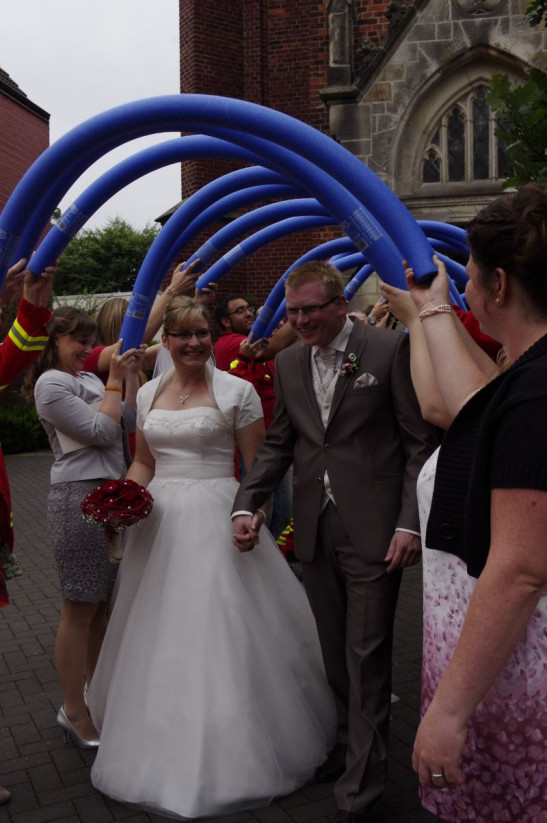 Natürlich haben wir das Ehepaar vor der Kirche mit einem Spalier aus Flossen und Pool-Nudeln empfangen. Außerdem hatten wir unser Motorboot Albatros mitgebracht, sodass unser Bootsführer André seine Sandra in den Hafen der Liebe fahren konnte. Wir wünschen dem Brautpaar alles Gute für die gemeinsamen Jahre! ... Mehr erfahren