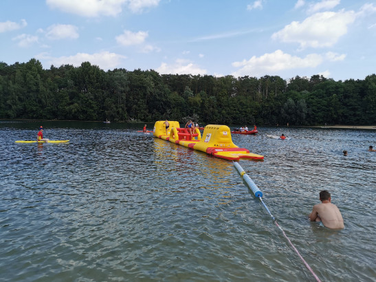 Schon von weitem zog das gelb-rote 17,5 Meter lange Gebilde auf dem Feldmarksee am Sonntag alle Blicke auf sich. Bereits seit dem frühen Morgen waren die Helfer*innen der Deutschen Lebens-Rettungs-Gesellschaft (DLRG) Ortsgruppe Sassenberg vor Ort. Eine besondere Herausforderung stand an, denn mit dem Feldmarksee war der Aquatrack erstmals auf einem Freigewässer aufgebaut. Sechs Große Teile mussten aufgeblasen, ins Wasser gebracht, verbunden und am Grund verankert werden. Dank vieler helfender Hände war aber pünktlich um elf alles bereit für den Start der Team-Challenge. 13 Teams gaben alles, überquerten Kletter- und Hangelelemente und stürzten sich mutig über Wasserlöcher, um schließlich von einer Rutsche aus in den See zu gleiten. Schnell eine Ente geschnappt, musste die natürlich auch s ... Mehr erfahren