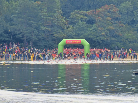 Um 9:30 Uhr gingen am Sonntag bereits die ersten Triathleten ins Wasser. Zuerst starteten die Sportler mit der längsten Strecke in der Mitteldistanz. Unter Führung der DLRG Ortsgruppe Sassenberg waren Einsatzkräfte aus insgesamt sieben Ortsgruppen auf dem Feldmarksee. Mit Motorrettungsbooten und Rettungsbrettern, aber auch von Tretbooten aus hatten sie die Schwimmer jederzeit gut im Blick. Doch auf die Einsatzkräfte der DLRG kamen noch zahlreiche weitere Aufgaben zu. Bereits am Samstag waren sie mit Motorrettungsbooten auf dem See und setzten zahlreiche Bojen, Bälle und Leinen, um die vier unterschiedlichen Schwimmstrecken abzugrenzen. Am Sonntag fuhr außerdem jeweils einer der Rettungsschwimmer mit einem Rettungsbrett der Gruppe der Schwimmer voraus, um i ... Mehr erfahren